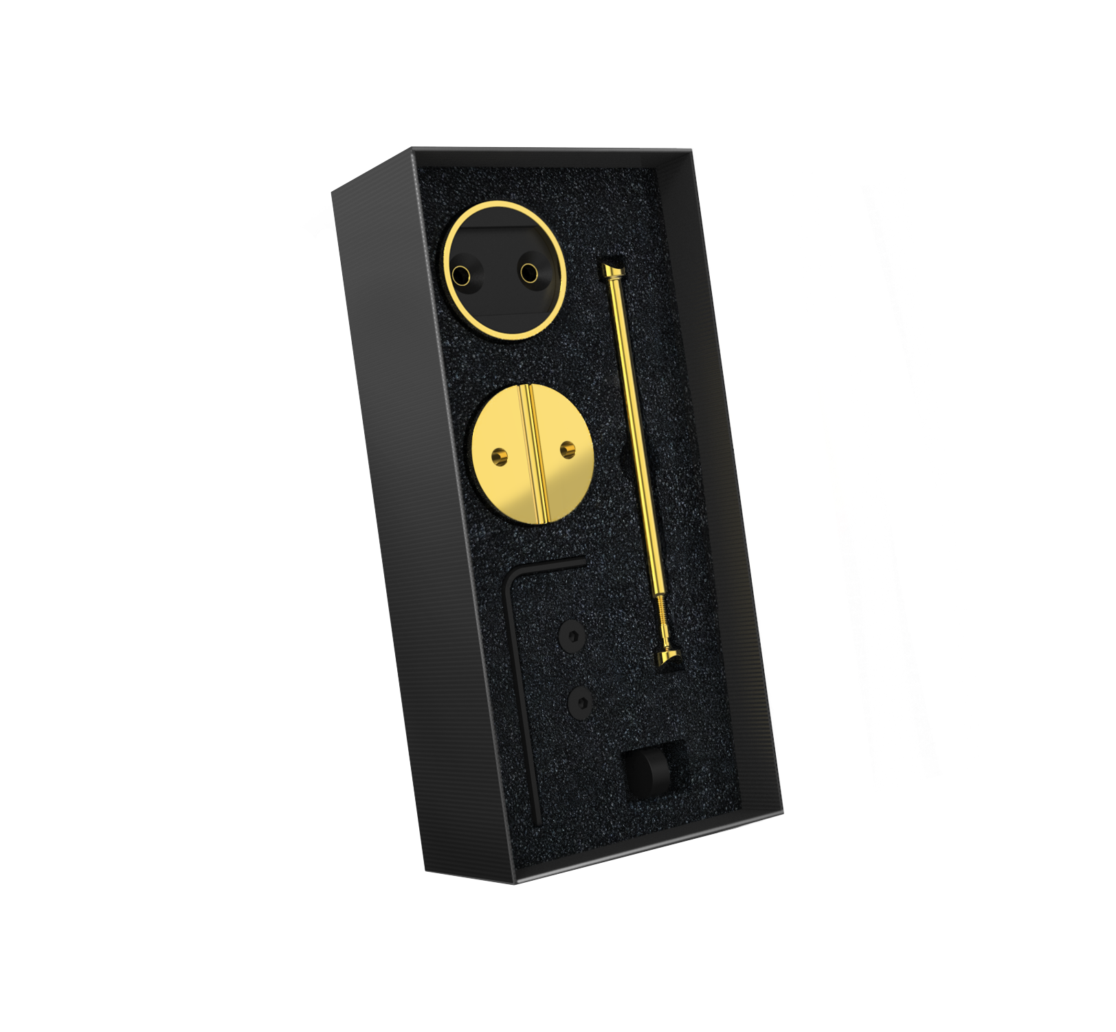 Deux pièces en laiton/inox, une pièce en acier, un disque magnétique, une souche autocollante clipsable, une vis, une clé Allen.